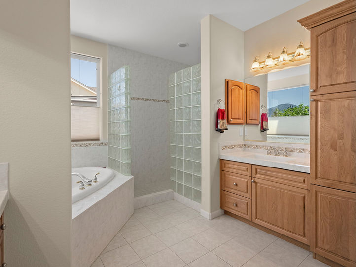 cooktop, a breakfast bar, double ovens, a built-in microwave, and a wine fridge. Expansive windows flood the home with natural light and provide stunning views of the Sierra Nevada Range. The covered patio is great for those sunny afternoons as you stare at the awesome Sierra Nevada Range. In the winter you can get into the hot tub and relax while still enjoying the view!! Primary room has great views and a spacious bathroom. With double sinks, jetted tub, shower stall with block glass and a walk in closet. The home also boasts a versatile bonus room on the second floor, complete with its own full bathroom—perfect for guests or visiting family. In addition to the three bedrooms, there is a den/office with elegant French doors. Both the front and backyard are meticulously landscaped, and there's ample space for an RV or boat. The three-car garage offers plenty of room for vehicles and recreational toys. Don’t miss the opportunity to make this beautiful property your new home!